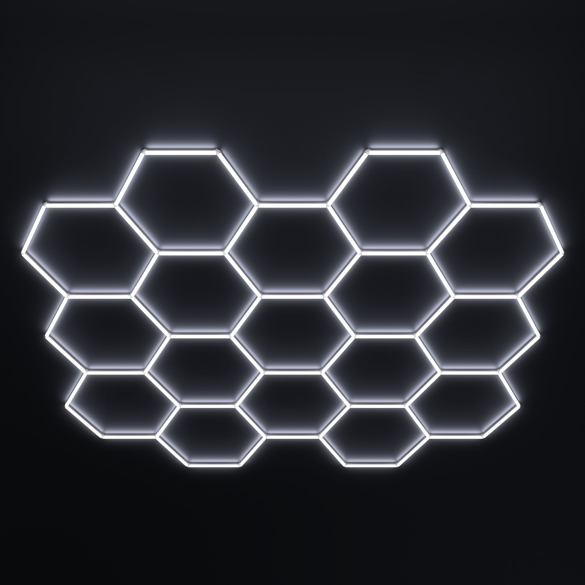 Découvrez notre NOUVEAU kit d'éclairage hexagonal de taille standard ! Ce modèle de 3,89 x 3,38 mètres, doté de 17 formes hexagonales LED lumineuses, est conçu pour offrir un éclairage moderne et fonctionnel. Facile à assembler, ce kit peut être suspendu ou monté pour s’adapter à tout garage, tout bureau, studio ou salle de sport.