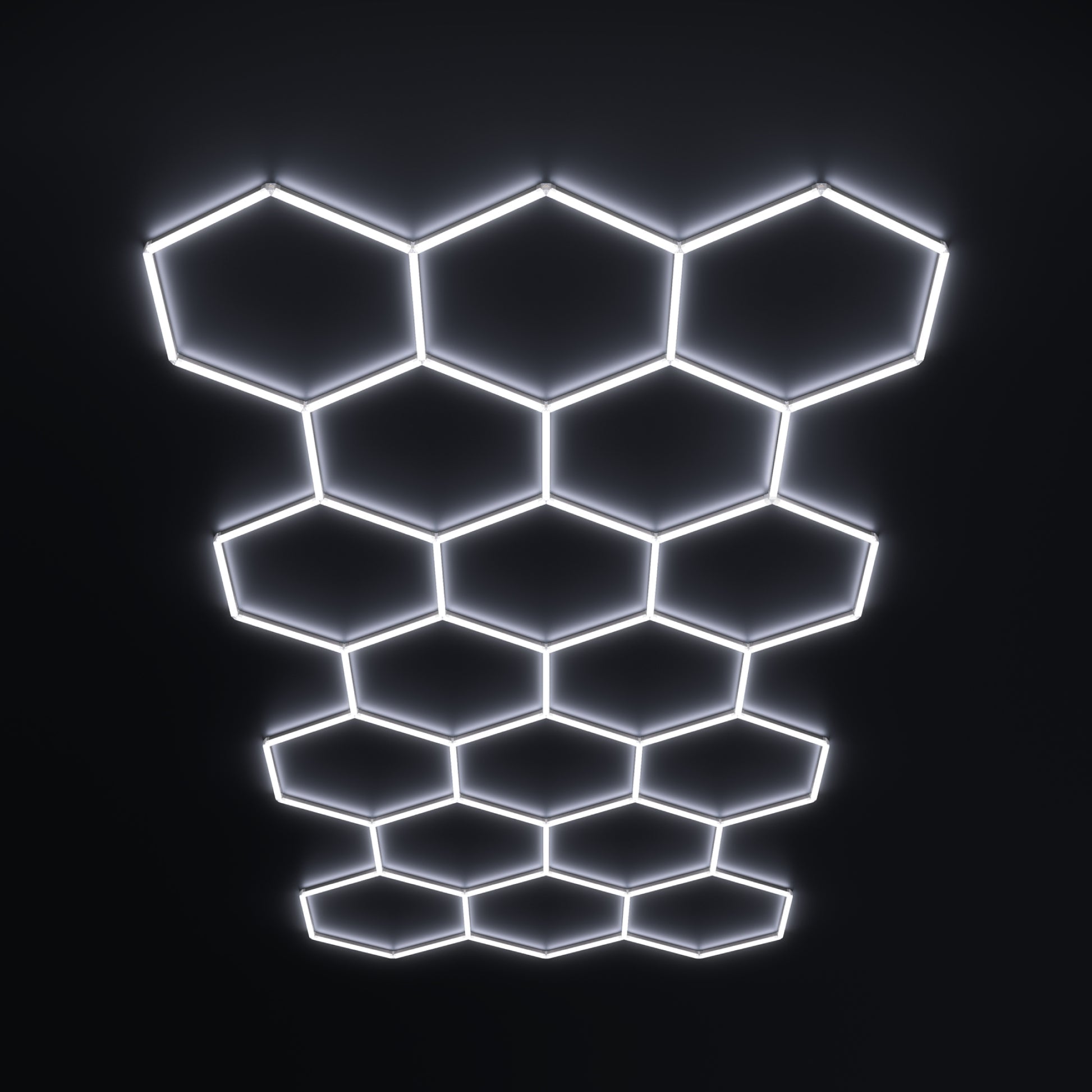 Découvrez notre NOUVEAU kit d'éclairage 18 hexagonaux ! Ce modèle de 5,18 x 2,44 mètres comprend 18 formes hexagonales LED lumineuses. Facile à assembler, ce kit peut être accroché ou suspendu pour s’adapter à tout garage, bureau, studio ou salle de sport. Idéal pour une grande baie ou achetez-en deux pour un garage à deux baies.