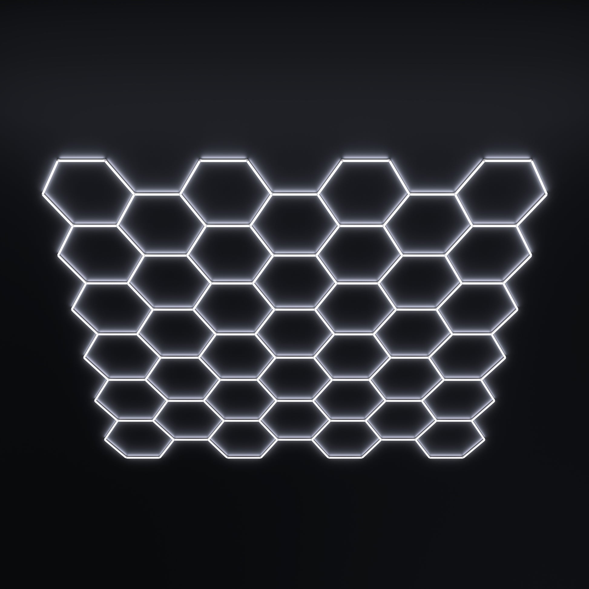 Découvrez une grille d'éclairage hexagonale imposante s’étendant sur 5,18 x 5,03 mètres. Ce modèle inclut 39 formes hexagonales LED lumineuses, composées de tubes et de connecteurs en aluminium légers, faciles à assembler. Parfait pour s’adapter à tout garage, tout bureau, studio ou salle de sport.